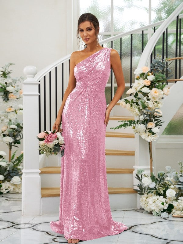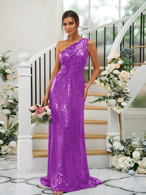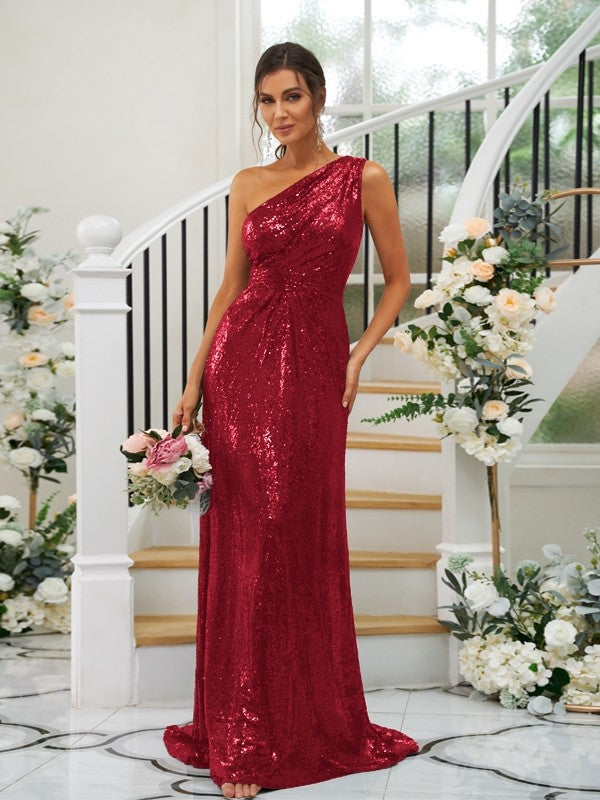 Sheath/Column Sequins Ruched One-Shoulder Sleeveless Sweep/Brush Train Bridesmaid Dresses