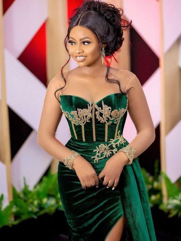 Sheath/Column Velvet Applique Scoop Sleeveless Sweep/Brush Train Dresses