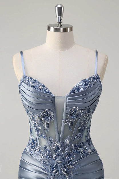 Sparkly Grey Blue Mermaid Ruched Corset Long Prom Dress with Appliques Sequins
