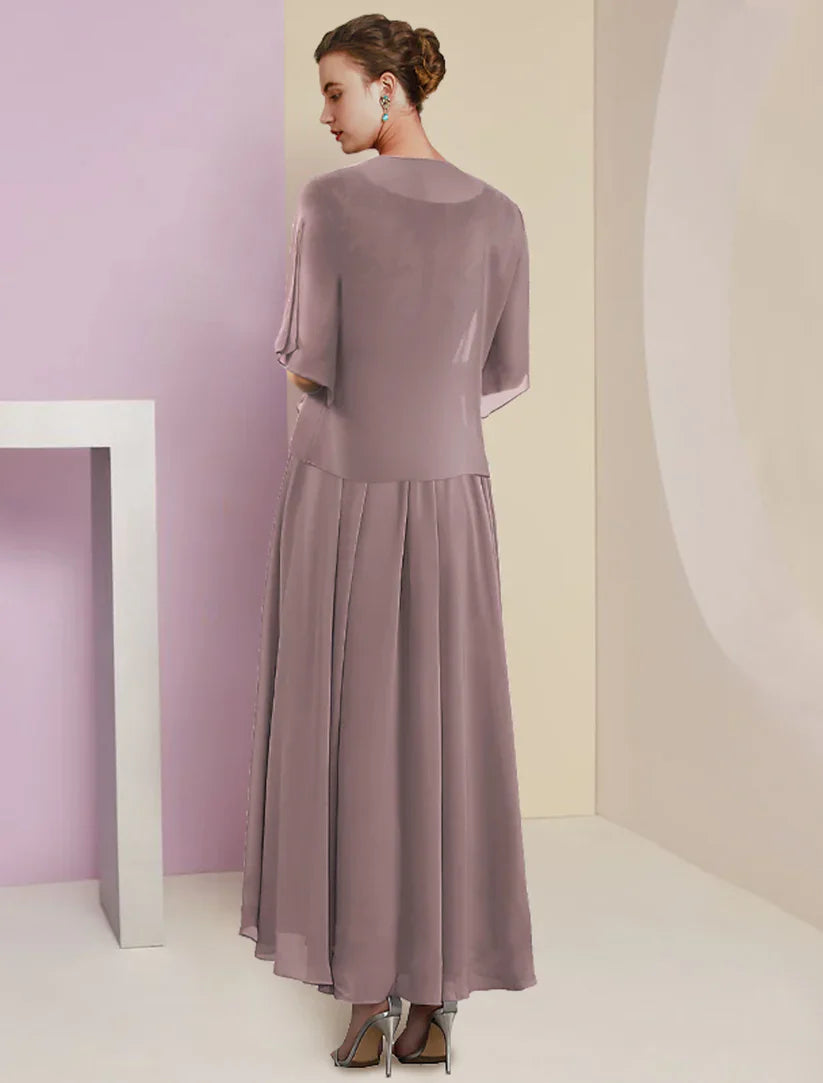 Two Piece A-Line Mother of the Bride Dress Formal Wedding Guest Elegant V Neck Tea Length Chiffon Lace Short Sleeve Jacket Dresses with Pleats Appliques